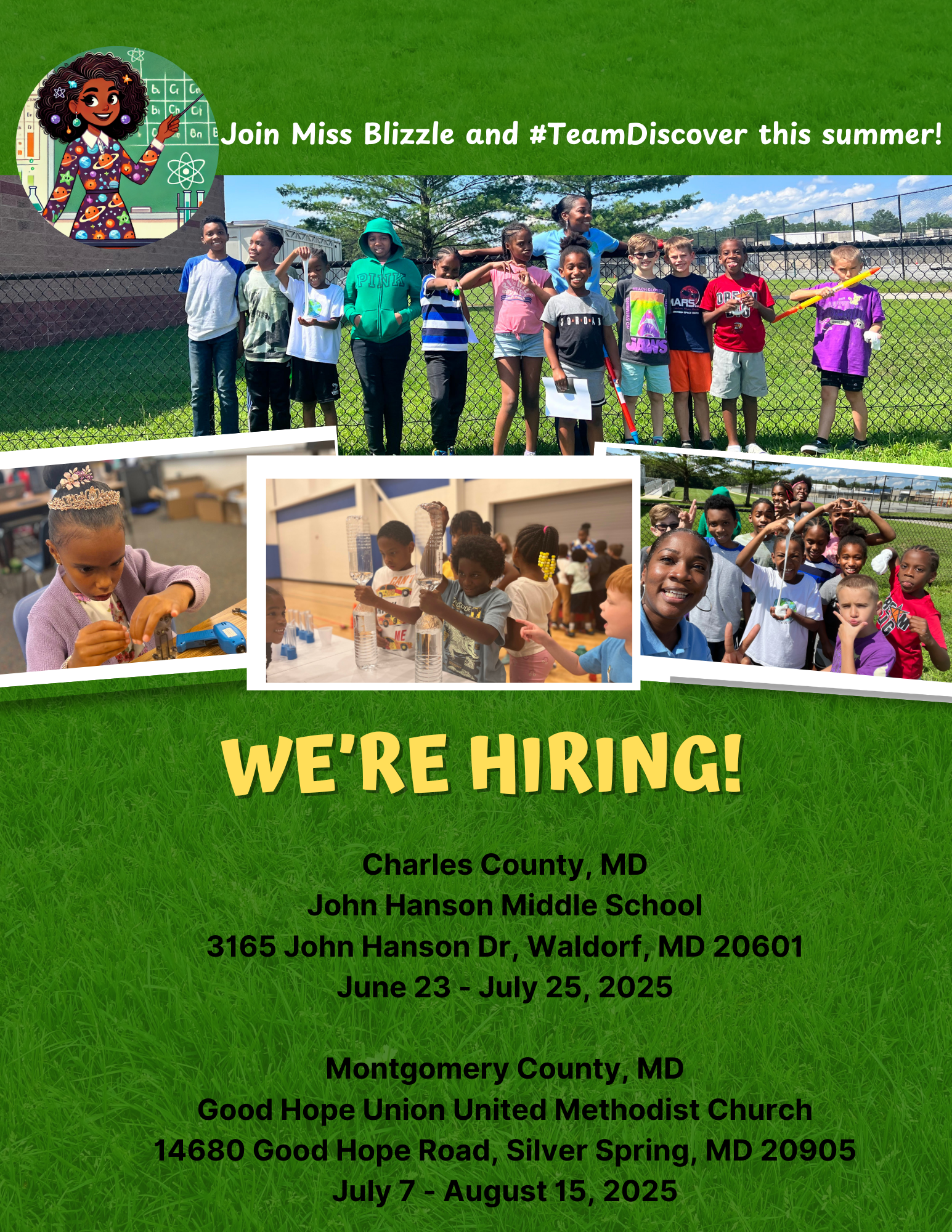 Discover Earth Camp is an earth and environmental science STEM day camp. To learn more about Discover Earth Camp, visit www.discoverearthcamp.com. We are hiring for our summer camp programming in Charles County, MD and Montgomery County, MD. Once again we have partnered with Charles County Parks and Recreation to offer STEM-themed summer camp fun at John Hanson Middle School in Waldorf, MD. We are also hosting our very own summer camp in Montgomery County, MD at Good Hope Union UMC located in Silver Spring, MD. We are looking to hire 2 Lead Camp Instructors, 2 Camp Counselors, and Junior Counselors for each location.